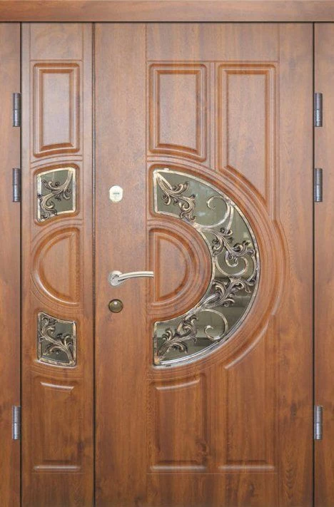 Поскольку в большинстве случаев устанавливаемые на входе в коттедж двустворчатые двери являются еще и предметом интерьера, украшающим здание, их дизайну предается особое значение. Эти двери, как правило, отделываются атмосферостойким МДФ, натуральным шпоном, массивом. Эффектно на таких дверях смотрится витражный узор, применение ковки, зеркальных элементов. Вариантов декора входной двустворчатой двери масса, тут все зависит от пожеланий заказчика.